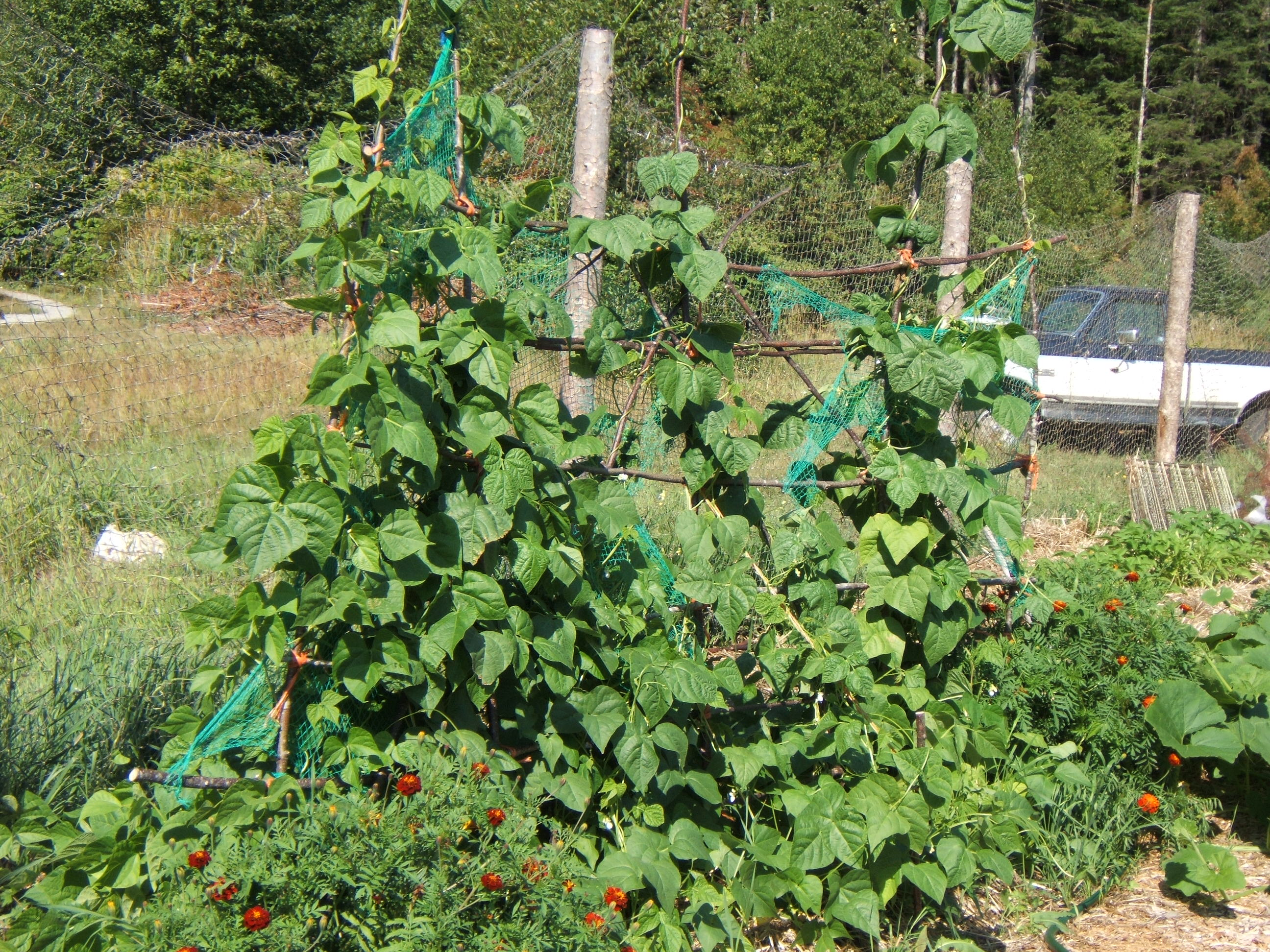Our first spring we enclosed the garden, using small tree trunks for poles and used