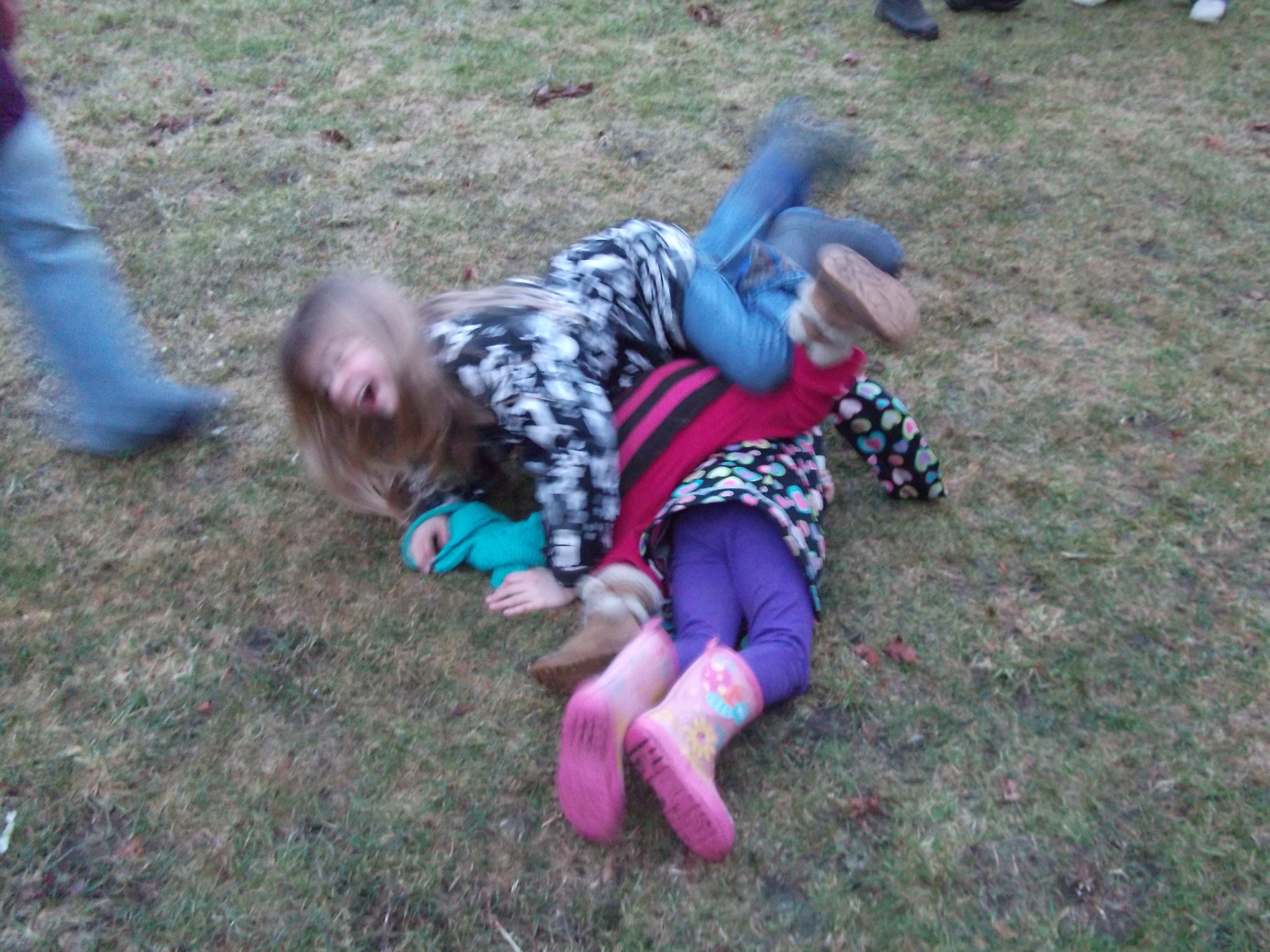 The girls practice their hockey moves. Juliet tops the scrum with Amelia on the