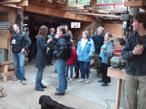 The revelers gather in Sam’s workshop. The birthday boy is that blur between the