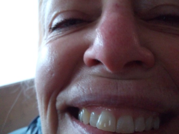 wrinkle under her nose is caused by her exaggerated smile.