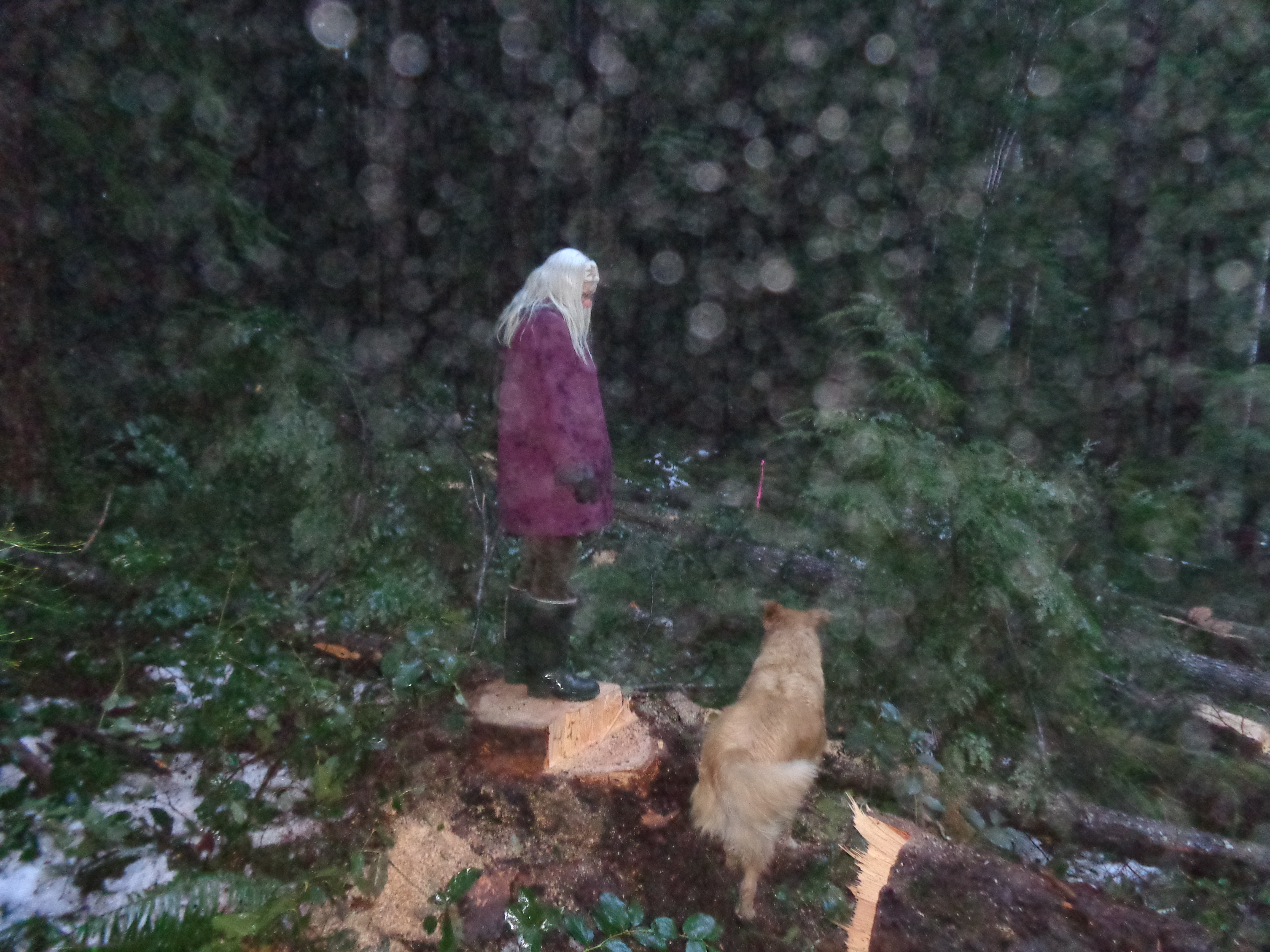 A month ago in a chilly rain, the first of hundreds of trees to be logged on our property took the plunge. We went over in the evening after the workers were done for the day. With one crew falling and another building roads, the area is far too dangerous for two civilians and one curious dog to be during working hours. Here Jude and Slinkee survey the scene.