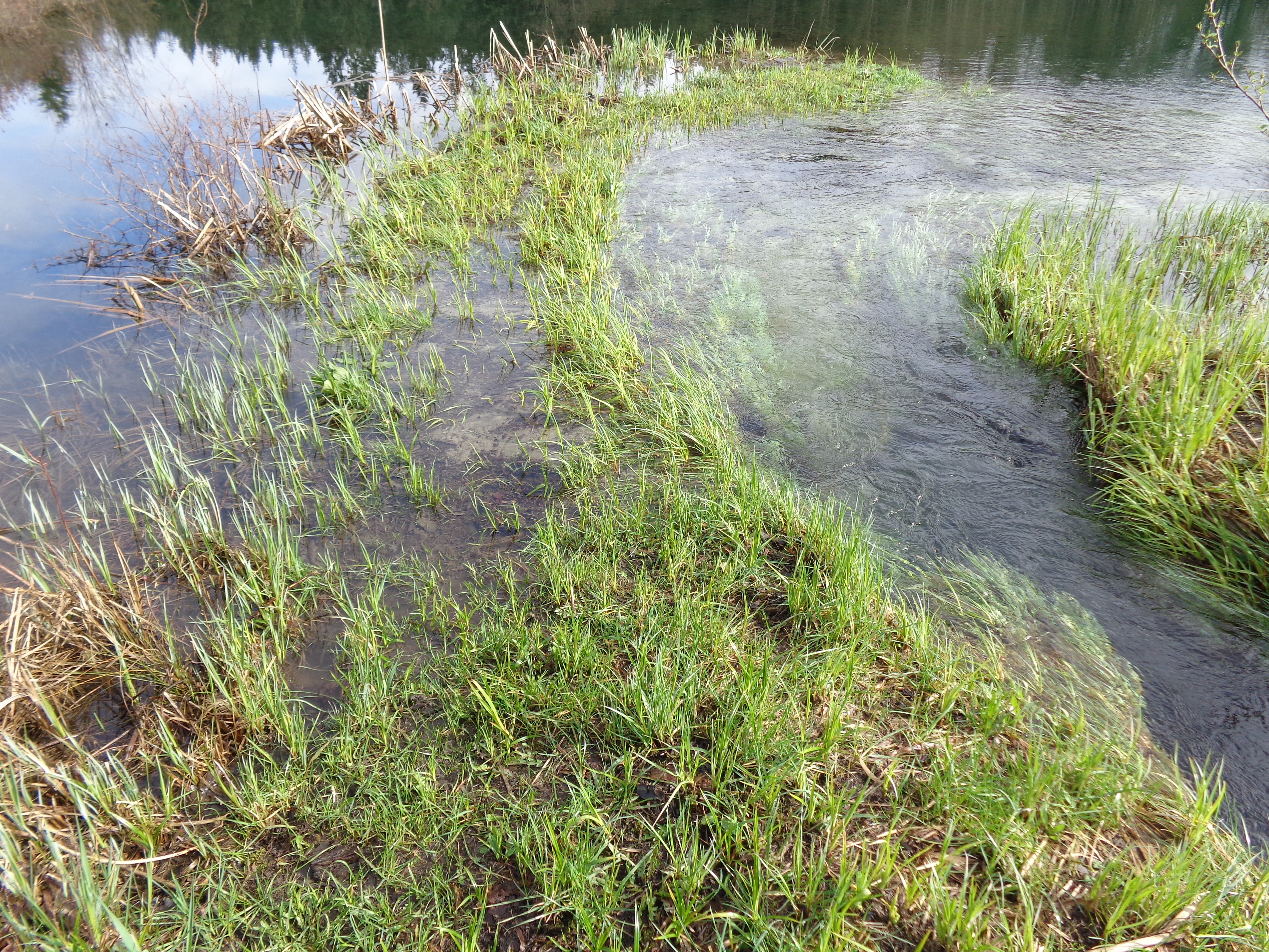 When we get a lot of rain in a short time, the peninsula that juts out into the pond our creek feeds is briefly inundated. Here it is a few days ago: